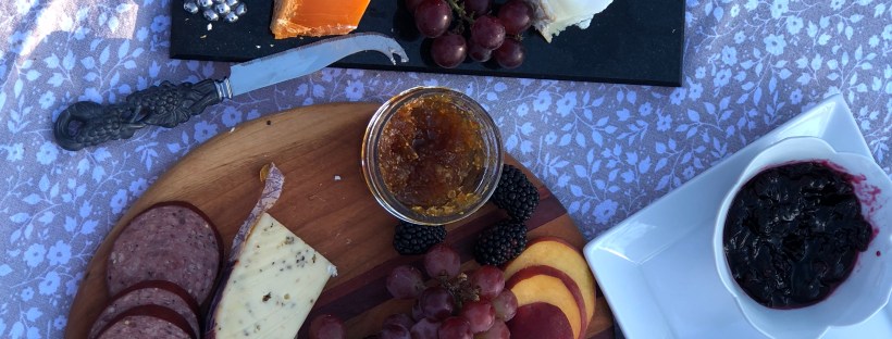 So his included pickled okra (he likes Southern cuisine) sliced peaches, a smoked chili cheddar, a Dutch black peppercorn Gouda (he LOVES pepper), summer sausage, and fig spread.