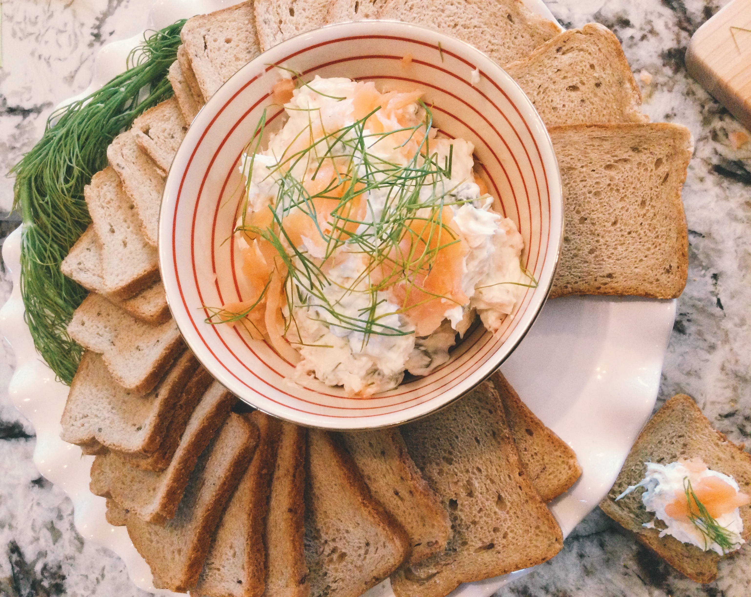 - 3 oz of smoked salmon, with one hunk reserved to garnish the tops of your crostini