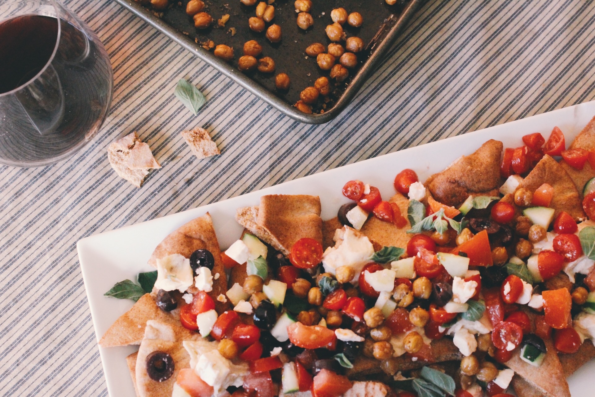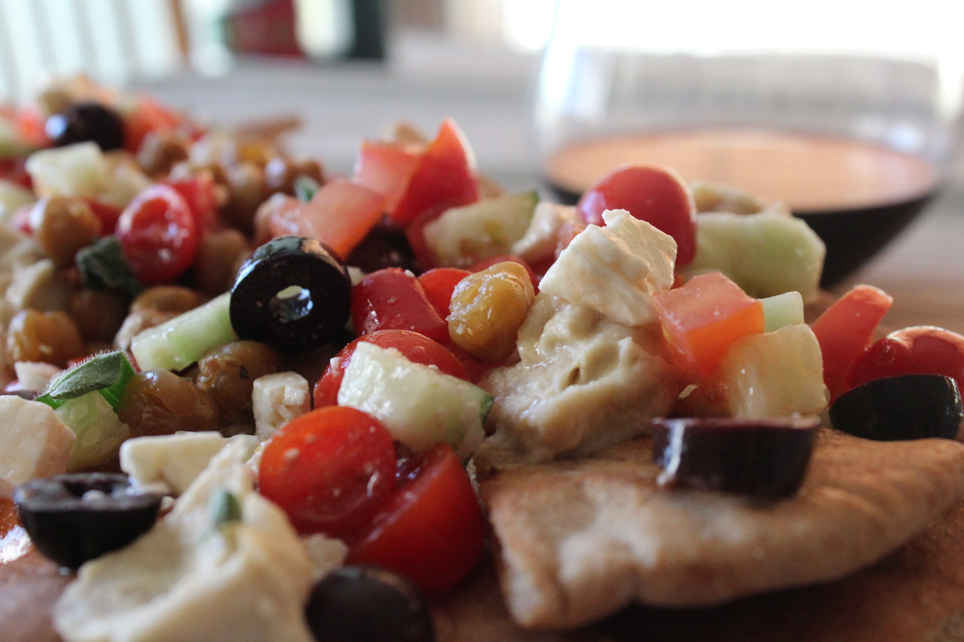 Get your serving platter ready and layer the toasted pita, then dollop the hummus around as you like. Spoon the tomato mixture over top, then sprinkle on the feta. Garnish with extra oregano leaves! Opa!