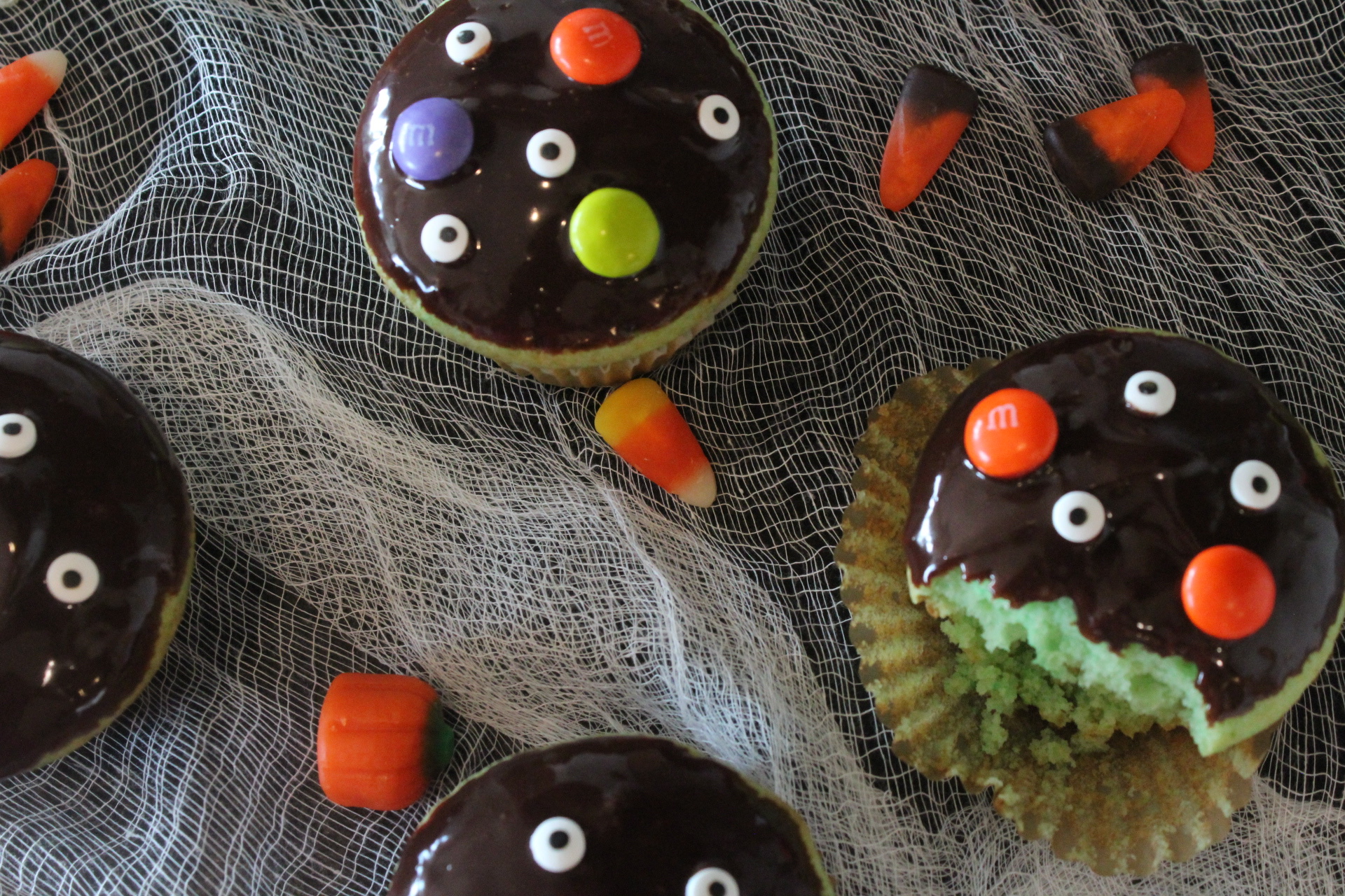 These cupcakes are so nice and, ahem, moist, and so much ding dang fun for Halloween! Ganache is a cinch to make and you can find the multi-colored candies at Sam’s club. I’m weirdly obsessed with having M&Ms in every seasonal color…tell me you’re the same? It’s a compulsion, I literally cannot stop it. The candy eyes are available at Walmart or on Amazon. The forest green food coloring is from Hobby Lobby, I think they add a nice earthy green to these cupcakes. It’s not the St. Patrick’s, kelly green you get from the stuff that comes with the other colors in the box. Plus I think it looks more like “the Creature” from Mary Shelley’s Frankenstein. Crazy book, if you’ve ever read it! I listened to a podcast about it one day, and apparently Mary Shelly was snowed in on a dark and stormy weekend in Switzerland with some other authors when she came up with the idea for Frankenstein. They all tried to outdo each other in writing a scary story to give each other a thrill, and that’s how The Creature came to be!