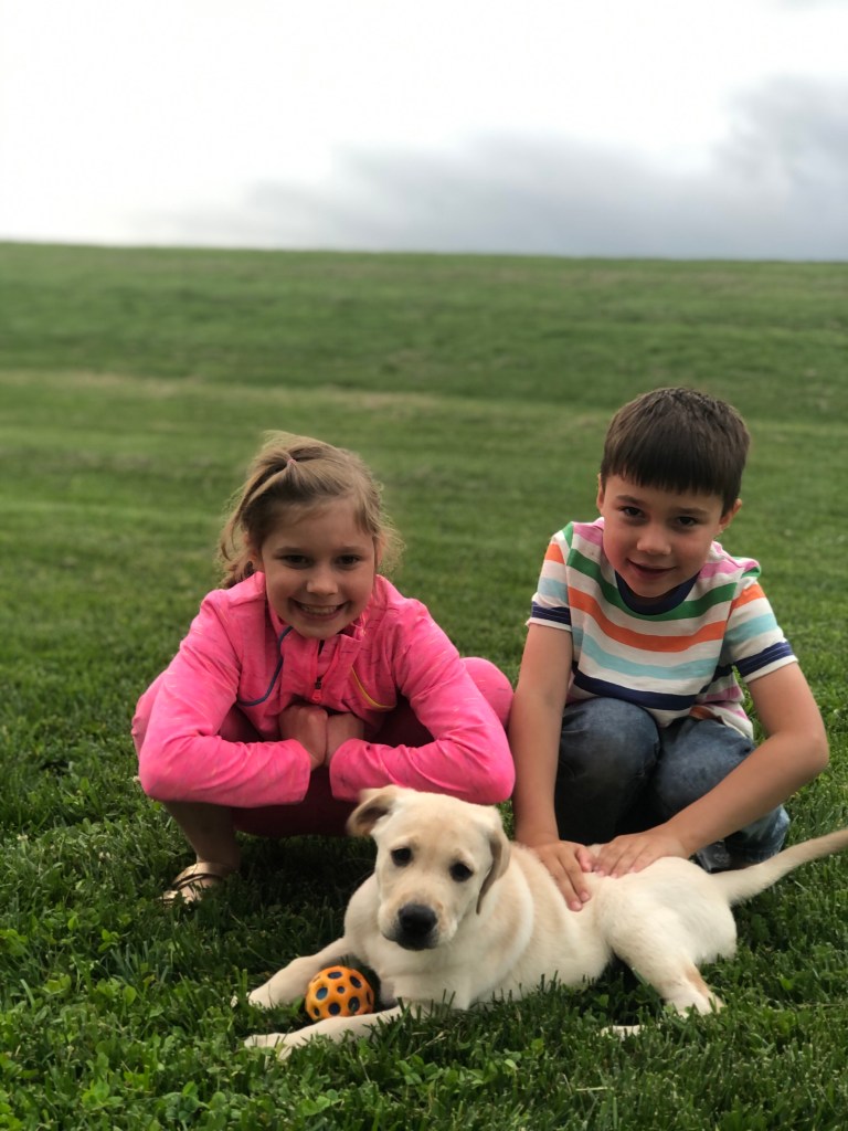 We have a puppy! Her name is Ginger, and she’s such a sweetie! Cal loves just hanging out with her, and she has fit into our family perfectly. Playful, but not too hyper, rambunctious but sweet-tempered, she’s perfect. She’s a yellow lab and I’ve already taught her to sit, shake, lay down, and now we’re working on “roll over” which is taking a bit longer, but she’s so smart! I think we worked on “sit” for all of three minutes. I just stumbled upon a sign advertising lab puppies for sale on our way home from visiting family for Memorial Day, and that night she was ours!